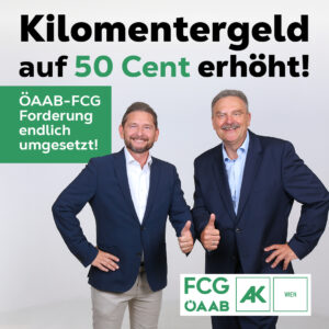 Langjährige Forderung der FCG-ÖAAB-AK-Fraktion wird endlich umgesetzt. Mit 1. Jänner 2025 wird das km-Geld auf 50 Cent je km angehoben. Mit dieser Anhebung werden die Arbeitnehmer:innen welche auf ihr Fahrzeug angewiesen sind entsprechend entlastet. Ebenso werden die Tagesdiäten und das Nächtigungsgeld angehoben. Deine FCG-ÖAAB-AK-Fraktion wird dich auch weiterhin auf dem laufenden halten.